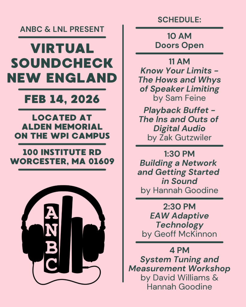 Join ANBC and WPI’s LNL for some audio nerdery at Virtual Soundcheck 2026 in Worcester, MA. Check back soon for announcements of seminar topics, gear demos, and more!